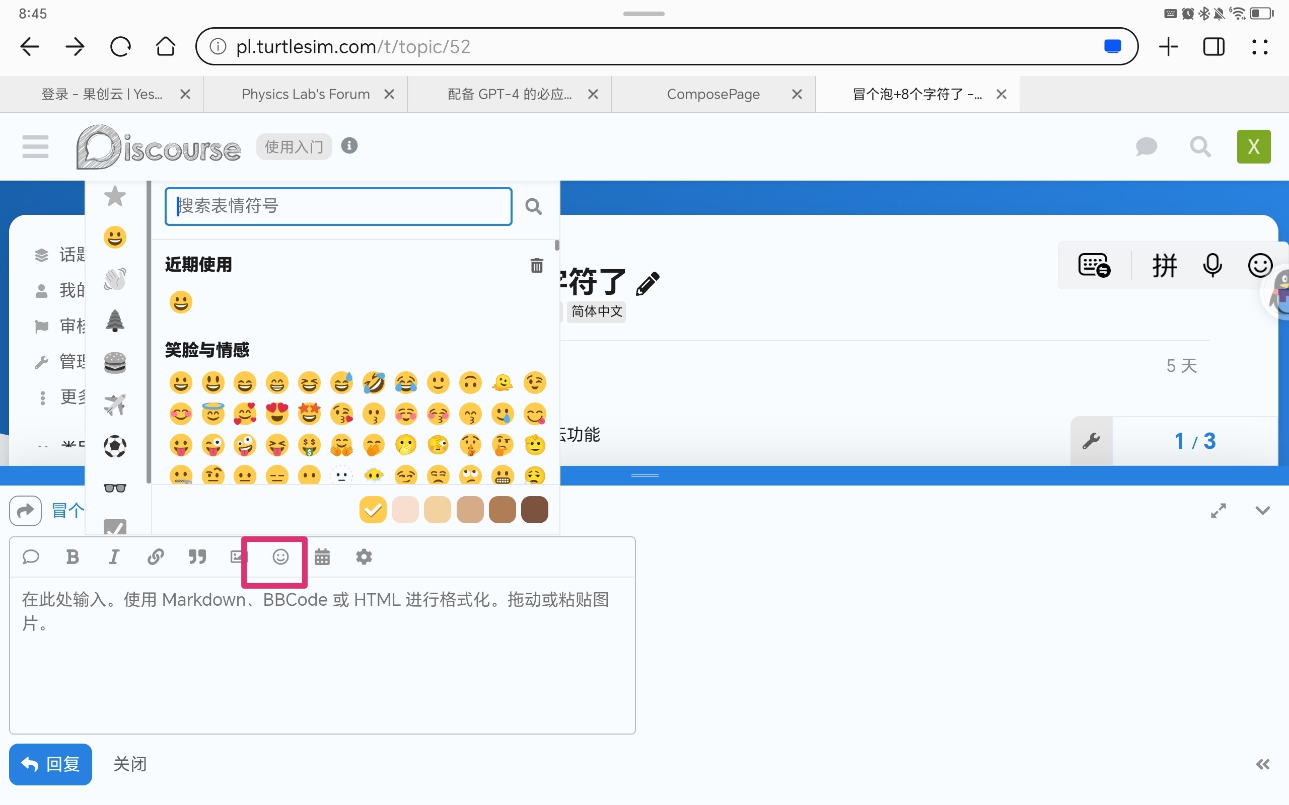 - 表情符号:如果你想要表达一些情感或者态度,你可以使用表情符号。在Discourse里面,有很多种表情符号可供选择,你可以点击编辑框下方的笑脸图标来浏览和插入。表情符号可以让你的回复更生动和有趣,也可以让其他人更容易感受到你的氛围和情绪。如图所示: