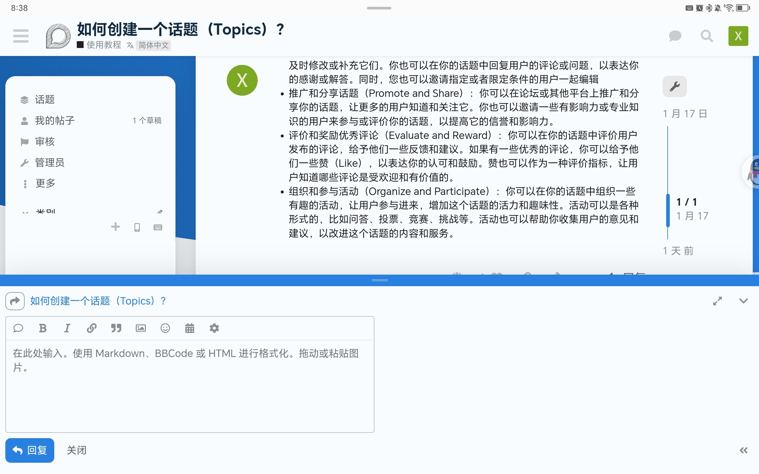 首先,你需要知道如何回复他人的帖子或者主题。在Discourse里面,有两种回复的方式:一种是直接回复某个帖子,另一种是回复整个主题。直接回复某个帖子的方法是点击你想要回复的帖子下方的“回复”按钮,然后在弹出的编辑框里面输入你的内容,最后点击“发表”按钮。这样,你的回复就会出现在那个帖子的下方,并且会显示一个小箭头,表示你是回复了那个帖子。如图所示: